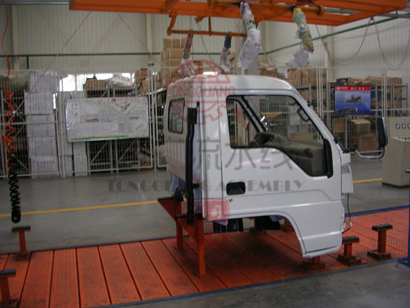 工藝:吊裝車架總成放在裝配線軌道的裝配小車上裝燃油箱及管路裝變速操縱機構(gòu)裝轉(zhuǎn)向器合件及管路裝制動、轉(zhuǎn)向操縱機構(gòu)裝各胎架、消聲器、空濾器裝發(fā)動機前面支撐吊裝發(fā)動機變速箱組件連接傳動軸裝水箱等冷卻裝置并連接進排氣系統(tǒng)管路裝發(fā)動機 線束并連接、裝駕駛室支撐加注柴油、機油吊裝駕駛室裝轉(zhuǎn)向油罐、舉升油缸及翻轉(zhuǎn)裝置、尾燈裝置連接管線及操縱裝置裝蓄電池連接電源線翼子板擋泥板裝輪胎及備胎,調(diào)整保險杠和踏腳板、離合器及制動拉桿行程加注防凍液、轉(zhuǎn)向液壓油、檢查調(diào)整下線轉(zhuǎn)調(diào)試工段。